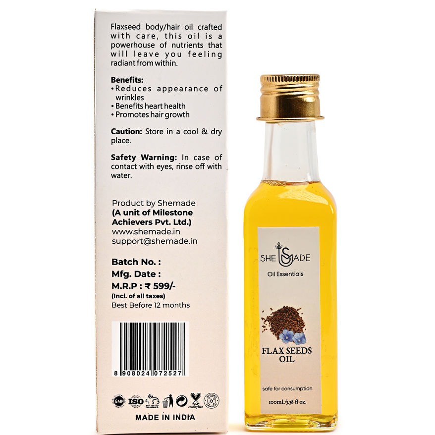 - ODiscover Shemade’s Flaxseed Body & Hair Oil, a 100ml, unisex, Indian-made elixir rich in omega-3s, B vitamins, and vitamin E. This sulfate-free, cruelty-free, paraben-free oil nourishes skin, fights frizz, promotes hair growth, and supports heart and digestive health. Massage into skin or hair, leave on, then rinse. Safe for consumption. Avoid eye contact. Patch test first. Contact support@shemade.in for support.