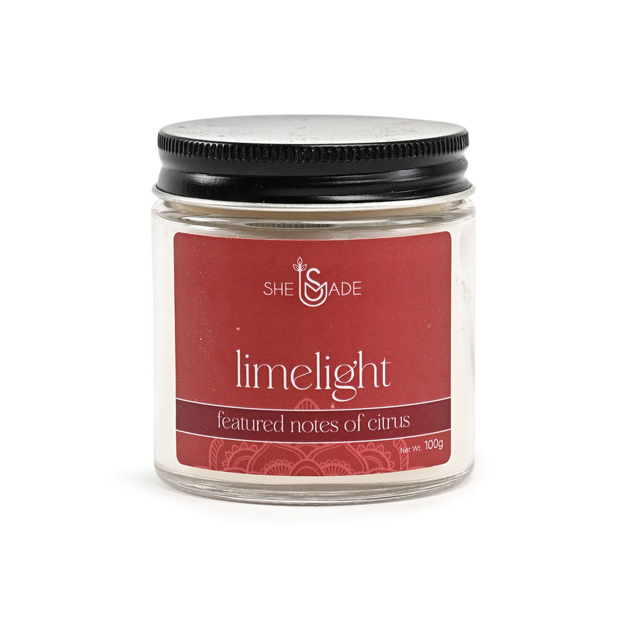 Experience the Limelight Candle with refreshing citrus notes, crafted with natural soy wax for a clean burn. It reduces stress, revitalizes, and boosts focus. Always burn within sight, away from flammables, children, and pets. Trim the wick to 1/4" before each use, burn up to four hours at a time, and discontinue use when 1/2" of wax remains. Product Type: Scented Candle, Net Quantity: 100 gm, Country of Origin: India. Handcrafted by Shemade.